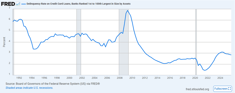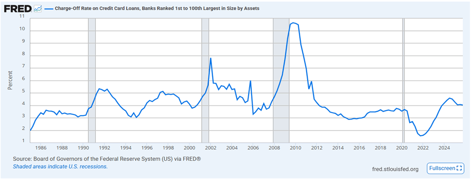 In the fourth quarter of 2025, credit card charge-offs and delinquency rates—often viewed as an early indicator of future charge-offs—declined very slightly. More significantly both metrics continue to show stabilization at an elevated level historically.